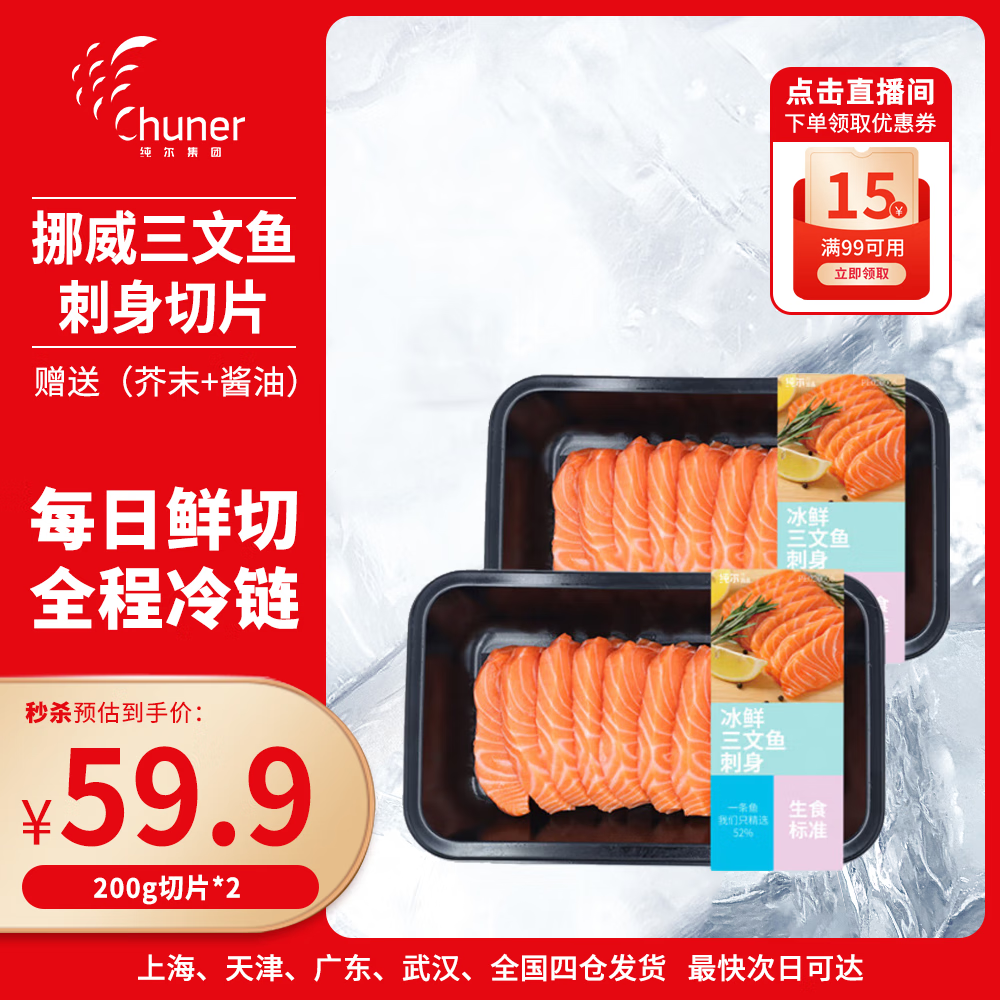 包邮 纯尔挪威三文鱼切片【冰鲜即食】净重200g*2 生鲜 源头直发 可生食